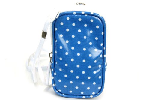 【スペック(約cm)】 サイズ:縦:約12cm 横:約8cm マチ:約2.5cm ストラップの長さ:約86cm/カラー:MINI DOT ROYAL BLUE/素材:オイルクロス/仕様:ファスナー開閉、携帯用ポケット×1/